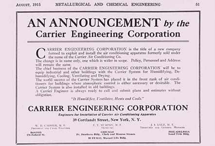 A cég társalapítója, Alfred E. „Ned” Stacey készítette az alábbi ikonikus fotót. Carrier a cég newarki új kutatólaborjában látható 1918-ban, nem sokkal a cégalapítás után.